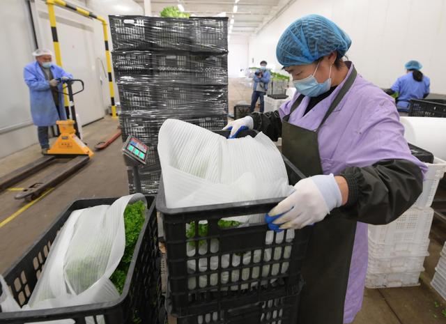 ↑在上海由由农业科技公司位于崇明区中兴镇的种植基地内,工作人员为供应市区的生菜装箱(4月19日摄)。