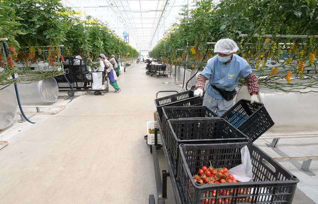 ↑在上海由由农业科技公司位于崇明区中兴镇的种植基地内,工作人员在采摘小番茄(4月19日摄)。