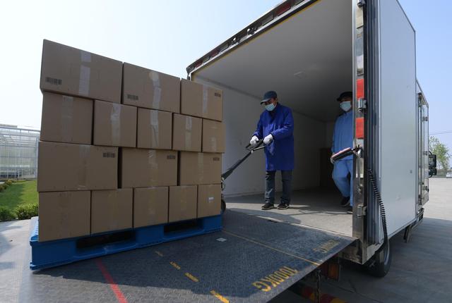 ↑在上海由由农业科技公司位于崇明区中兴镇的种植基地内,工作人员将包装好的蔬菜装车,准备送往市区(4月19日摄)。