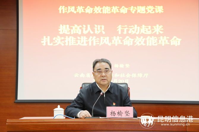 昆明信息港讯 记者江枫 4月20日,省委组织部副部长,省人力资源社会保障厅党组书记、厅长杨榆坚,以“提高认识、行动起来,扎实推进作风革命效能革命”为题讲党课,教育引导全厅党员干部职工坚定信念、增强党性,积极投身作风革命、效能革命,以时不我待、只争朝夕、拼搏奋进的精神状态,加倍努力往前追赶,推动人社事业高质量发展。