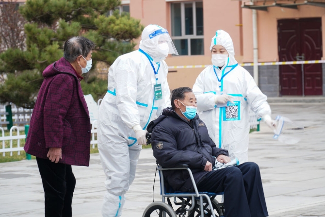 4月15日,在青海省西宁市城西区一处核酸检测采样点,防疫工作人员为行动不便的老人开通“绿色通道”,方便他们完成核酸采样。(新华社记者 张子琪 摄)