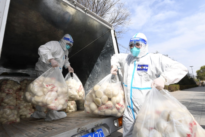 4月18日,在西宁市城西区馨宁小区入口处,葛发明(右)和同事正在搬运给小区居民配送的生活物资。新华社记者 范培珅 摄