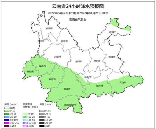 在谷雨节气的头几天,云南的天气没那么“应景”。从4月21日开始,影响云南的降水系统趋于减弱,大部地区雨过天晴,气温也开始稳步攀升。云南省气象台预计,21日,昆明主城区多云间晴,气温12~23℃。全省范围内,昭通北部、保山、德宏、临沧、普洱、西双版纳、玉溪西部、红河南部、文山南部多云有阵雨局部中雨,其他地区晴间多云。