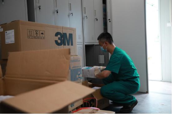 开舱前黄一乐正在一更区摆放防护物资
