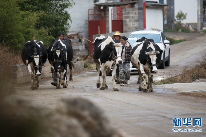 洱源县三营镇永乐村委会,村民们赶着奶牛到挤奶站进行集中挤奶(摄于4月1日)。(新华网 赵普凡 摄)