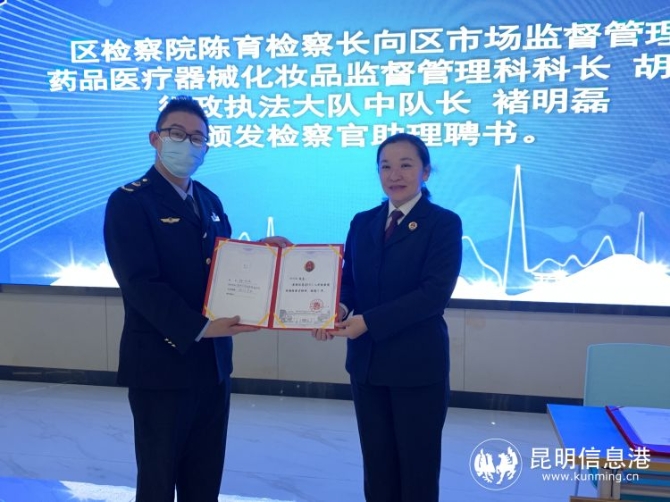 活动现场,区人民检察院聘任区市场监管局两名工作人员兼任检察官助理,为检察机关办案提供专业支持,并向两位专业人员颁发聘书,以提高知识产权执法保护的专业化程度。