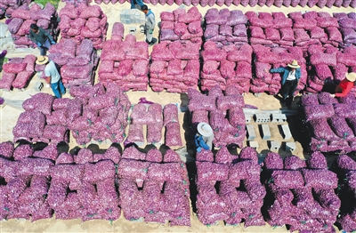 谷雨时节,天气晴朗,在麒麟区越州镇横大路村的杨氏大蒜交易市场里,一个个装满干蒜的袋子整齐堆放成一堵堵“蒜墙”。这边,几名工人正把一袋袋压在底部的大蒜腾挪到上面,使其接受阳光的充分照晒;那边,一袋袋刚从地里挖出来还带着泥土气息的新鲜蒜头被从农用车上搬运下来,市场负责人杨石所的妻子忙着过秤、付款,空气中弥漫着浓浓的蒜味,大家脸上洋溢着丰收的喜悦。