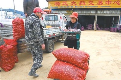 蒜农小余用自家的三轮车拉来7袋蒜头,这已经是他第三次来“交货”了。他说:“我家地里的大蒜采收已进入收尾阶段,个头有点小,品质也一般,但总的收入还是比去年高,最后这点蒜头就算卖不上价钱也不影响我明年扩大种植面积的决心。”