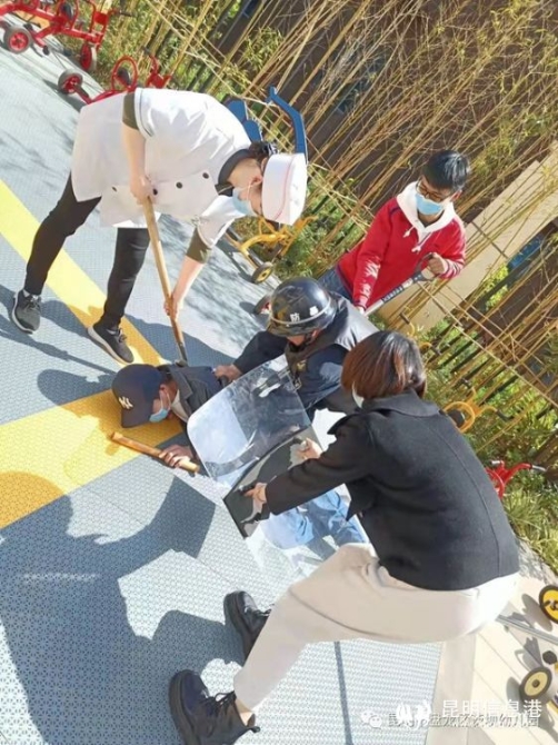 下午15:00演练活动正式开始,孩子们像往常一样进行着户外游戏活动,一名“歹徒”尾随一名教师在回园进侧门之际强行闯入幼儿园,一名保安及教师进行制止,另一名保安立即按下幼儿园一键报警设备,幼儿园第一时间拉响了警报,全体教师立即停止游戏活动,迅速召集幼儿,提醒幼儿不要慌乱,在老师们的指引下迅速就近躲藏、避险。全体幼儿全部进入活动室后,教师及时将门窗锁好,用坚实的工具、物品抵挡门,指导幼儿躲在安全位置,确保孩子们的安全。幼儿园应急保卫小组与保安合力将歹徒用警棍、钢叉等制服,由园长联系辖区派出所民警将歹徒押送至公安机关,幼儿园解除警报。