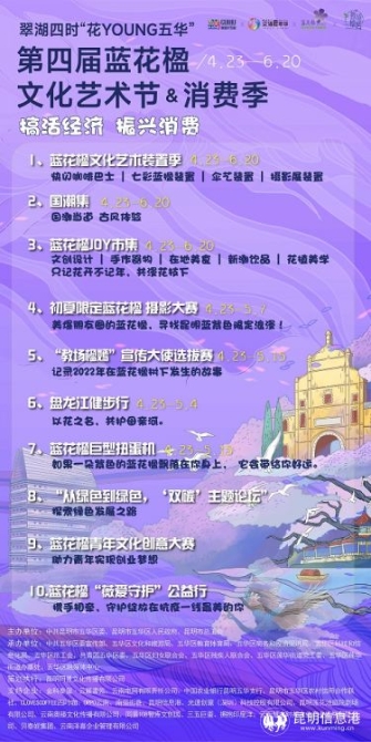 今年的艺术节还设置了许多有趣好玩的活动。蓝花楹文化艺术装置季有快闪咖啡巴士、七彩蓝楹、伞艺、摄影展装置等现场布置,国潮市集活动设置了汉服体验,此外还有盘龙江健步行、蓝花楹青年文化创意大赛、蓝花楹“薇爱守护”公益行等有趣项目,以花为媒,以文化赋能,推动“文化+创意”“文化+生态”“文化+消费”的融合发展,助力五华区文旅产业高质量发展。