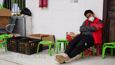 “他太累了,昨晚下物资熬了一晚上,早上又老早起来搬物资送菜。”一旁的工作人员说道。