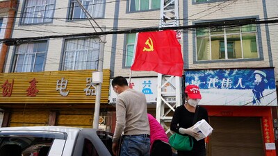 与此同时,街道上,许多志愿者纷纷从插有党旗的小货车上下来,各自拿上分配好的医疗物资,朝居家隔离健康监测的群众家走去。