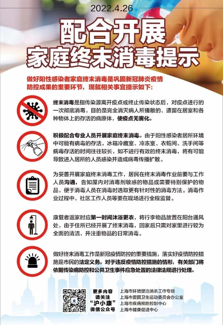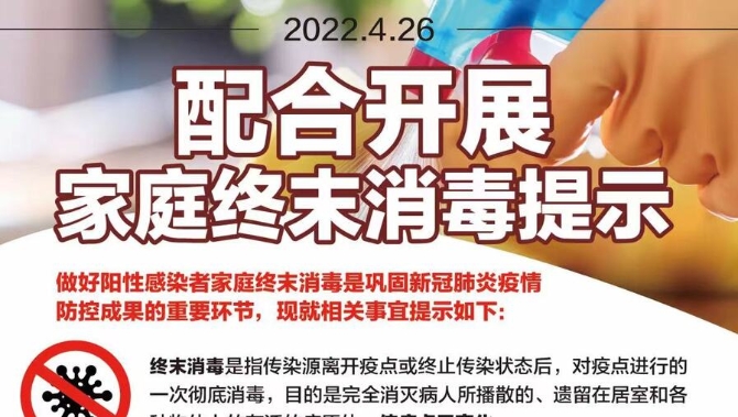 做好阳性感染者家庭终末消毒是巩固新冠肺炎疫情防控成果的重要环节,为此,市环境整治消杀工作专班、市爱国卫生运动委员会办公室、市疾病预防控制中心、市健康促进中心特别发布五点重要提示:
