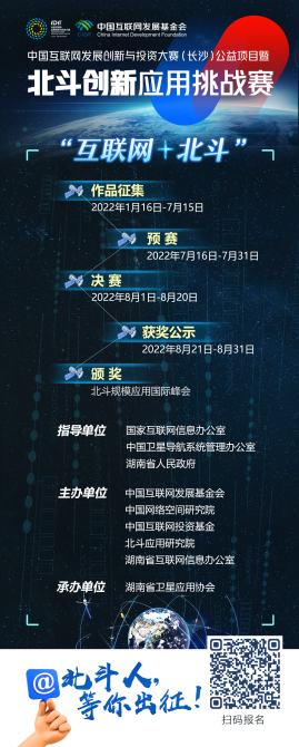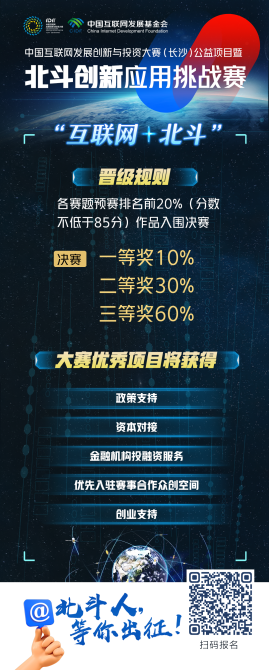 浩瀚星空,北斗璀璨,2021中国互联网发展创新与投资大赛(长沙)公益项目暨北斗创新应用挑战赛报名正在如火如荼地进行中。本次大赛以“互联网+北斗”为主题,旨在推动北斗与大数据、云计算、人工智能等网信技术的融合创新,探索北斗领域“揭榜挂帅”与赛马机制。获奖的优秀项目,将有机会获得政策支持、资本对接、创业空间和创业服务等一系列奖励措施。