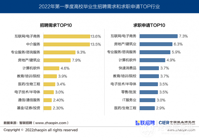 报告将企业招聘职位和名称描述中有“应届”字段的视为毕业生需求端数据;将最高学历为大专以上,毕业时间为两年之内、无工作经验的求职者视为高校毕业生供给端数据。数据显示,2022届高校毕业生规模预计为1076万人,高于2021年909万人,同比增加167万人。从环比变动来看,今年一季度高校毕业生招聘需求人数下降6%,求职申请人数上升16%,使得高校毕业生就业市场景气指数环比下降0.17;从同比变动来看,本季度高校毕业生招聘需求人数下降8%,求职申请人数上升75%,使得高校毕业生就业市场景气指数同比下降0.63。