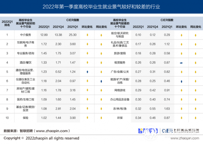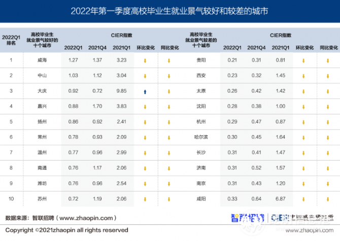 智联招聘近日发布《2022年一季度高校毕业生就业市场景气报告》,其中指出,今年一季度高校毕业生就业市场景气指数(CIER)为0.71,降至2020年疫情暴发以来最低点,而且明显低于全国平均水平1.56,就业压力较大。