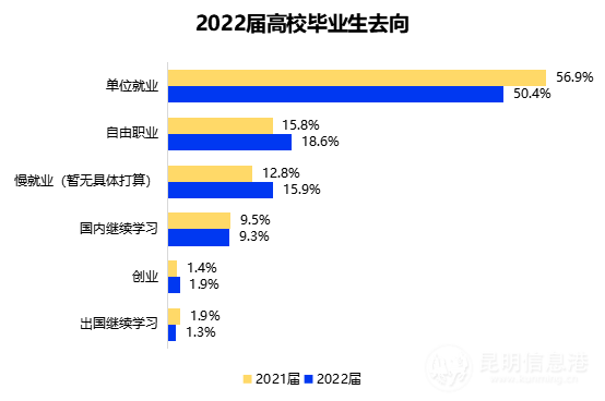 报告选取的调研时间为3月中旬至4月中旬,主要围绕就业去向、就业期待、求职心态与行为、求职进展等维度开展。调研显示,2022届高校毕业生中50.4%的人选择单位就业,比去年下降6个百分点。而自由职业(18.6%)、慢就业(15.9%)的比例均较去年提高3个百分点。这是继去年之后,连续第二年呈现单位就业比例下降,自由职业、慢就业比例上升的特征。而在考研热趋势下,选择在国内继续学习的比例占近一成,出国继续学习的比例为1.3%,比去年略低。