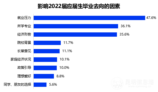 当前国内疫情反复,经济发展和就业市场承压,感受到今年求职竞争非常激烈的应届生比例为61%,比去年高6个百分点。应届生选择去向时考虑的因素中,就业压力占比最高,为47.6%,其次为所学专业(36.1%)和经济形势(35.6%),院校背景、长辈意见、理想爱好等因素影响程度较低。