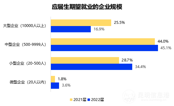 国企仍是毕业生首选,占比44.4%,高于2021年的42.5%。选择民营企业的占比17.4%,比2021年的19%继续下降。国企热、考公潮升温,民企热度降低,折射出本届毕业生在选择工作上的求稳心态加剧。本届毕业生中有45.1%的人青睐规模在500-9999人的中型企业,占比最高,并高于2021年的44%。同时,毕业生对小微企业的选择增多,2022年选择微型企业、小型企业的毕业生占比3.6%、34.4%,高于2021年的1.8%、28.7%。这对小微企业来说,是个储备新生力量的好时机。