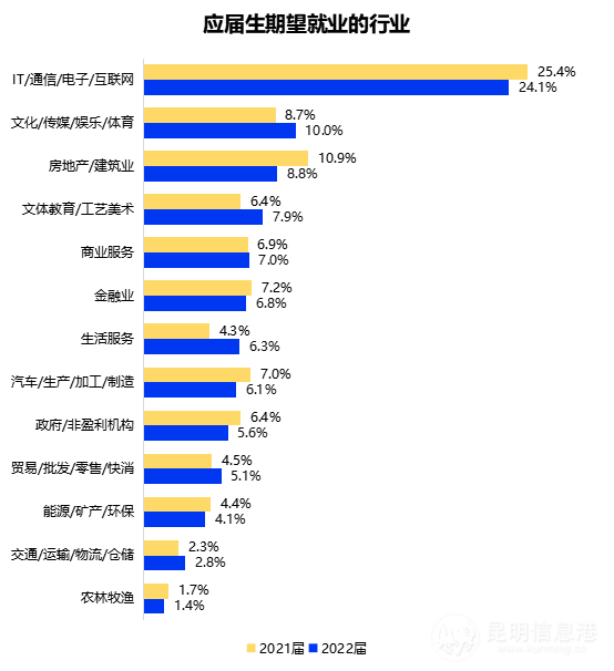 2022届毕业生期望去IT/通信/电子/互联网、房地产/建筑业行业就业的比例分别为24.1%、8.8%,比去年降低1.3个百分点、2.1个百分点。随着去年以来互联网、房地产行业发展放缓,招聘规模增速放缓或有所收缩,毕业生也应势调整就业期望,降低了对这两个行业的选择。