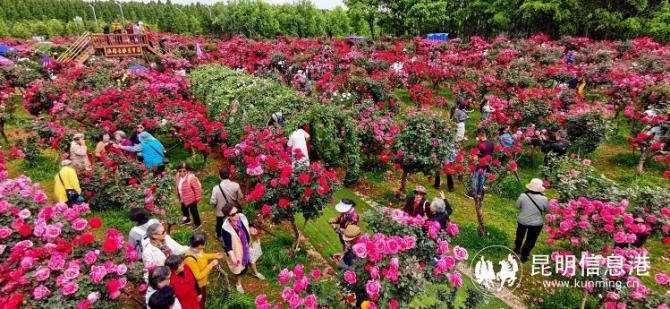 滇国古桩月季园与锦柏生态园相隔仅4公里路程,两个月季花园却是各具特点。滇国古桩月季园在占地仅10亩的土地上种植了1300多株古桩月季,还精心营造了天梯、鲜花拱门、花轿、月季花亭、十二生肖以及大象造型,堪称一个小而精致的月季花园。前来园内拍照赏花的游客带上了最美的衣裙,大家摩肩接踵地穿流于花海中,园中花团紧簇、花潮如海,而人潮也毫不逊色于花潮。