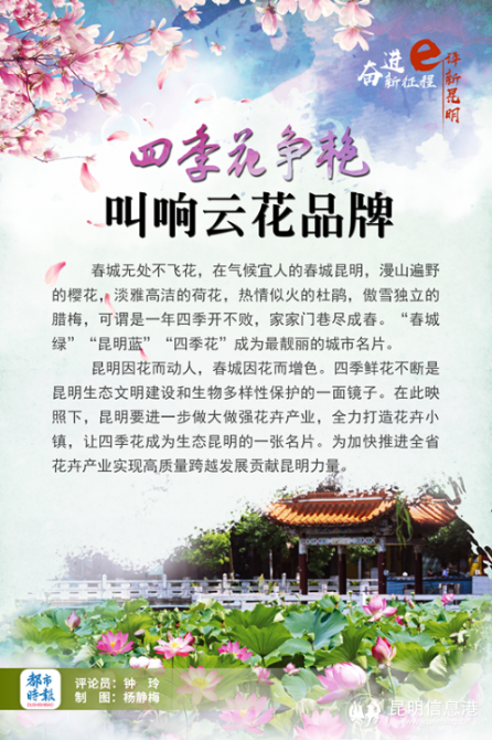 昆明因花而动人,春城因花而增色。四季鲜花不断是昆明生态文明建设和生物多样性保护的一面镜子。在此映照下,昆明要进一步做大做强花卉产业,全力打造花卉小镇,让四季花成为生态昆明的一张名片。与此同时,还要在加强自主品种培育与知识产权保护、推广绿色高效栽培技术、强化物流体系建设、打造“云花”品牌等方面持续发力,为加快推进全省花卉产业实现高质量跨越发展贡献昆明力量。(作者:都市时报钟玲)