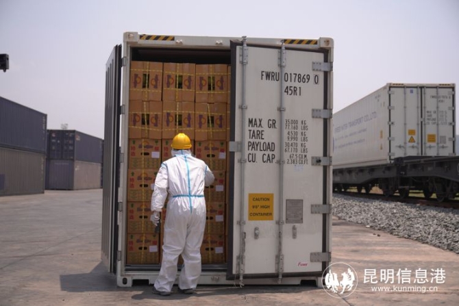 昆明信息港讯 记者上官艳君 4月28日,中铁集装箱公司携手中国铁路昆明局集团、老中公司共同打造的公铁联运服务产品,中老铁路首趟冷链水果专列从中国磨憨口岸发车,前往云南昆明,再分发至广州、重庆、上海等地,这是中老铁路开通运营以来,首次采用公铁联运、冷链集装箱“一箱到底”的方式运输鲜水果,丰富了冷链跨境物流模式,将惠及更多东盟国家和国内市场。