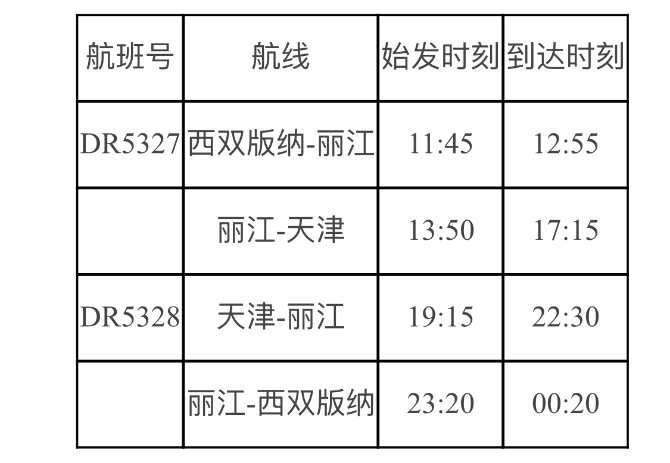 瑞丽航空新开“西双版纳-丽江-天津”航线
