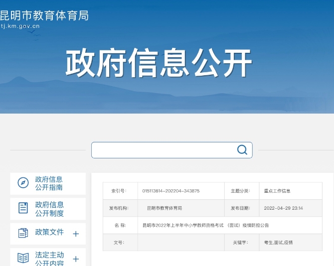 根据《云南省2022年上半年中小学教师资格考试(面试)公告》,结合省、市相关疫情防控要求,为做好面试期间的疫情防控工作,切实保障广大考生和考试工作人员的生命安全和身体健康,现将昆明市2022年上半年中小学教师资格考试(面试)疫情防控有关事项公告如下:
