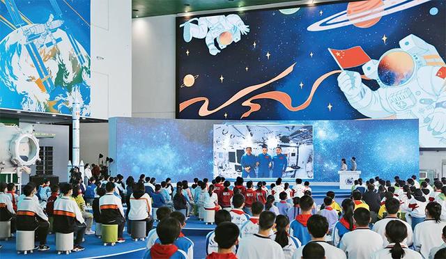 2021年12月9日,“天宫课堂”第一课开讲,神舟十三号乘组航天员翟志刚、王亚平、叶光富在中国空间站进行太空授课。图为学生们在中国科学技术馆听课。 新华社记者 金立旺/摄