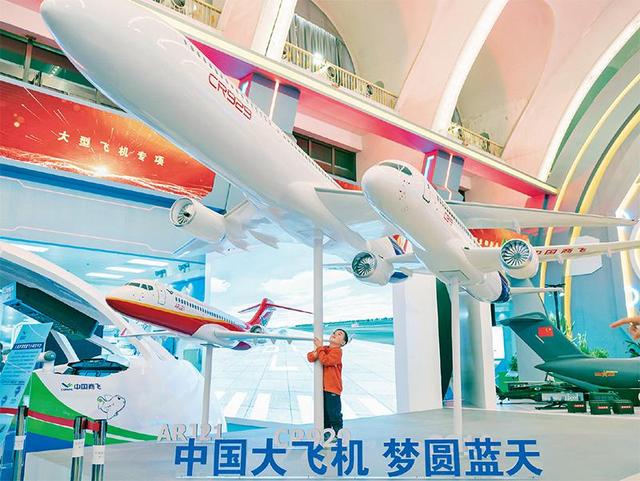 2021年10月21日,在北京展览馆举行的国家“十三五”科技创新成就展上,一名儿童在中国商飞展台观看飞机模型。 新华社记者 才扬/摄