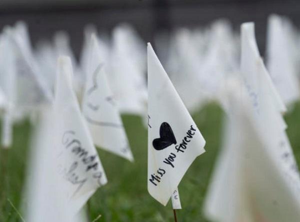 2021年9月17日,写有缅怀亲人词句的白色旗帜摆放在美国首都华盛顿的华盛顿纪念碑附近的草坪上,悼念该国新冠逝者。图源:新华社