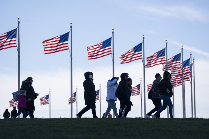 3月29日,行人走在美国首都华盛顿的国家广场。美国约翰斯·霍普金斯大学29日发布的新冠疫情最新统计数据显示,美国累计确诊病例超过8000万例。(新华社记者 刘杰 摄)