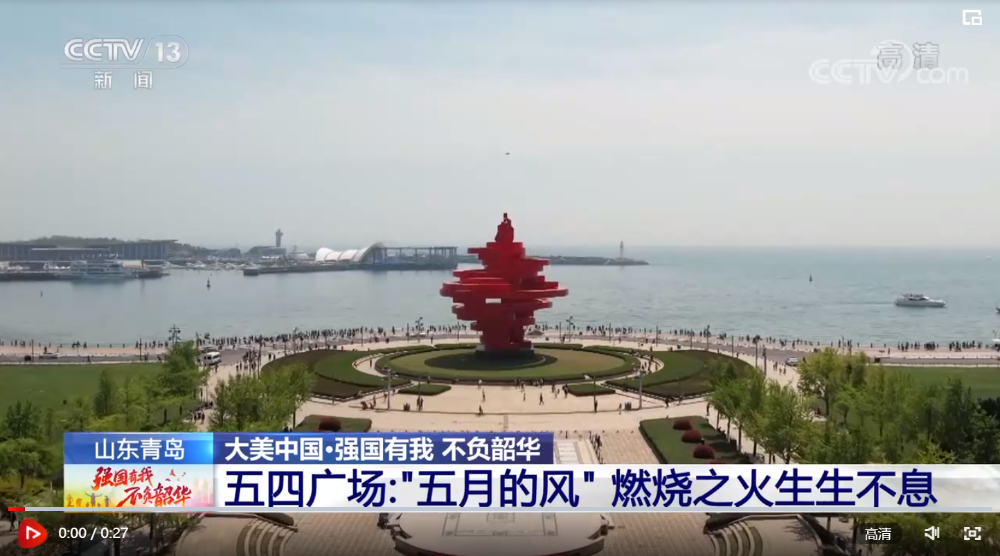 位于山东青岛的五四广场是一处占地面积10万平方米的现代化风格广场,为纪念五四运动而命名。这是广场上的标志性雕塑,名字叫“五月的风”,螺旋上升的风的造型和火红的色彩,体现着五四运动的爱国主义基调、张扬腾升的民族力量。