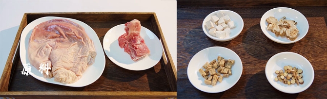 新鲜猪肚500克,排骨150克,党参10克,白术6克,茯苓6克,甘草3克,姜、油、盐适量。