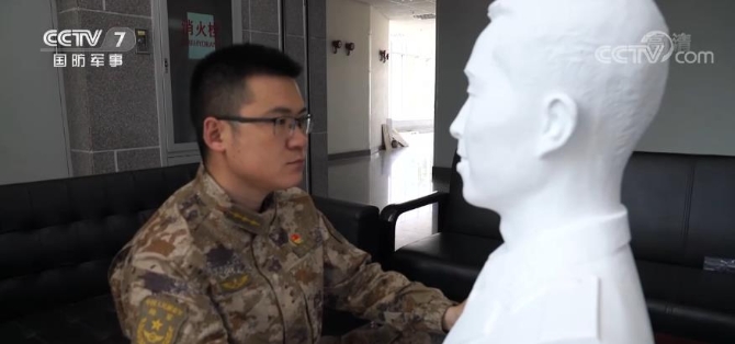 解放军文化艺术中心雕塑创作员郎钺向杜鹏飞讲述了为陈祥榕塑像的过程,杜鹏飞抚摸着雕像,心里有太多话想要对挚爱的战友诉说。
