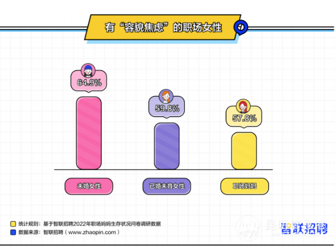 智联招聘数据表明,有容貌焦虑的职场妈妈整体占比为57.8%,低于未婚女性(64.9%)和已婚未育女性(59.8%),这与2021年的情况大体相当。其中,19%的职场妈妈给出了“外表怎样无所谓”的答复。分析认为,职场妈妈已经进入人生新的阶段,追求事业成功、自我提升的同时,对家庭和孩子的重视也让她们有了更丰富的人生追求,对人生成功的定义也更多元化,因此对容貌能更加坦然面对,悦纳自己。