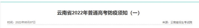 云南省2022年普通高考(含“三校生”考试)将于6月7~9日举行。为切实保障广大考生和考试工作人员的生命安全和身体健康,确保考试安全平稳顺利实施,现将考前疫情防控有关要求提醒如下:
