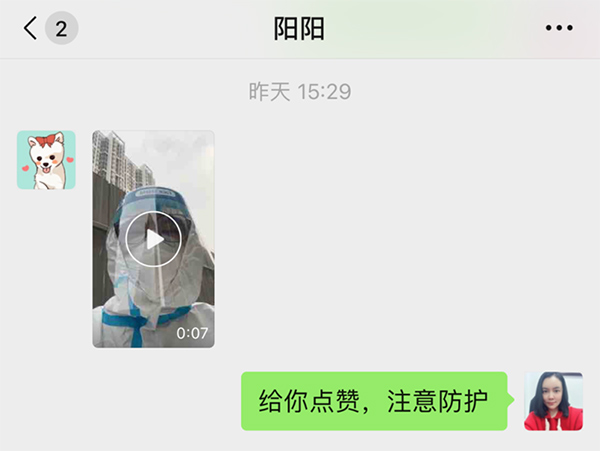 “我家孩子正在备考研究生,有一天拍了张穿防护服的照片发给我。”4月25日,家住周庄嘉园19号院的马女士收到女儿阳阳的微信消息,才得知女儿报名做了小区志愿者。“小区被管控,急缺志愿者,要不是我被封在家里,我也想去,没想到我闺女先去了。”马女士语气中透露着担忧与欣慰。