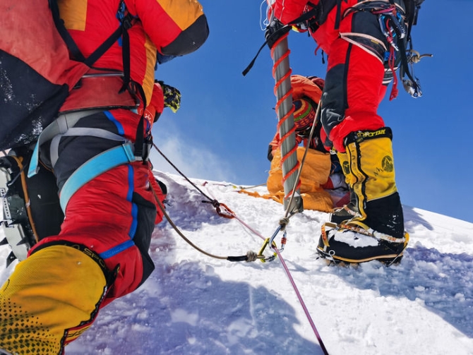 5月4日,在珠穆朗玛峰峰顶,科考队员在采集冰雪样品。新华社特约记者 索朗多吉 摄