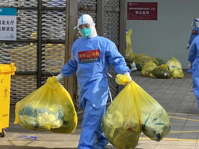 4月10日,新国博方舱医院面临保洁人员紧缺,堆积的医废垃圾急需转运,排除消防隐患,陆家嘴消防大队大队长李和清向仁济医院新国博方舱医院副院长陈尉华主动提出请战,将N1舱与N2舱以及卸货区的医废垃圾集中转运至户外临时堆放点。“当时消防员真是帮我们解决了大问题!”陈尉华说。