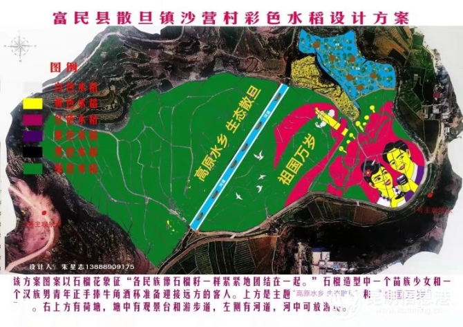 此次彩色水稻种植图案由专业的彩稻设计团队进行设计策划,昆明市农科院提供技术指导支持。设计图以“歌颂祖国、富民县创建全国民族团结进步示范县”为主题。在经过农技人员和农户们分区、拉线,到定点、插秧等多道工序之后,“祖国万岁””民族团结石榴花”“高原水乡,生态散旦”3个图案,只待时机成熟,便将为人们展现一幅幅精彩纷呈的画卷。水稻插秧预计10天完成,六一节前后就可以呈现初步效果,6月中旬至8月上旬将是图案的最佳观赏期。
