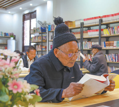 贵州省黔东南苗族侗族自治州岑巩县水尾镇岩下侗寨农家书屋以农业技术知识、文学等类别图书为主,设置了阅读区、休息区、民俗文化展示区等功能分区。图为村民在书屋阅读。胡攀学摄(影像中国)