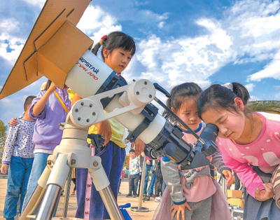 安徽省合肥市和六安市相关部门携手开展天文科普活动,通过互动游戏等方式提高青少年科学文化素养。图为六安市市民广场上,学生利用天文望远镜进行观测。田凯平摄(人民视觉)