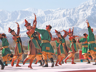甘肃省肃北蒙古族自治县乌兰牧骑舞蹈队在基层进行文艺汇演。张晓亮摄(影像中国)