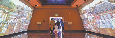 河南省洛阳市应天门遗址博物馆借助三维重建、沉浸投影、触屏互动等数字化技术,拉近观众与历史文物的距离。图为观众在观看历史浮雕投影。黄政伟摄(影像中国)