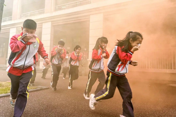 △5月12日,浙江省湖州市长兴县,某小学正在进行火灾应急疏散演练。