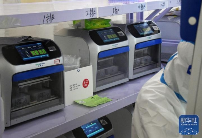5月12日,在位于北京市顺义区北务镇的气膜核酸检测实验室,工作人员在样本扩增区进行核酸扩增,确定样本是否为阴性。