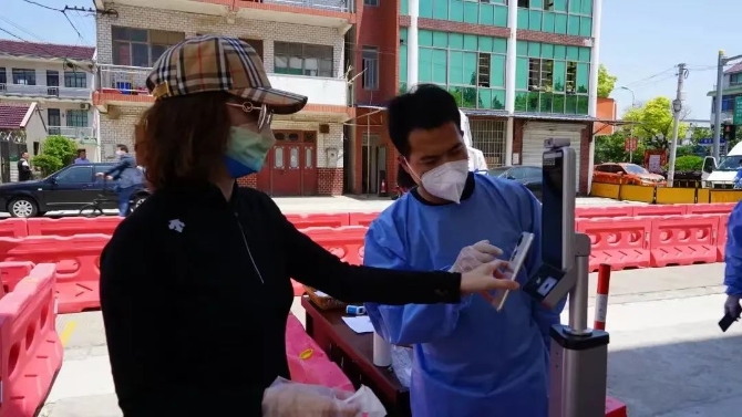 5月9日,在崇明港沿镇华联超市港沿一店入口处,市民们佩戴口罩,保持两米安全距离,有序排队。在志愿者的引导下,大家扫描场所码并使用“数字哨兵”进行测温、核验、身份登记,然后凭购物票进入超市采购,现场秩序井然。
