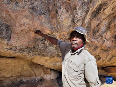 5月3日,在博茨瓦纳图利自然保护区内的莫哈巴能岩画遗址,向导曼亚查向记者介绍岩画。